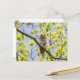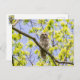 Num dia de primavera brilhante, uma coruja barrada pendurada numa árvore.