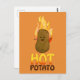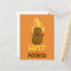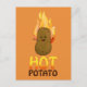 Um desenho animado de batata marrom com um sorriso grande e feliz, pontos para os olhos e paus para os braços. Ele está rodeado de chamas amarelas e cor de laranja queimadas. Abaixo dele, em texto laranja e amarelo, encontra-se a palavra HOT e abaixo dela, em texto castanho, está a palavra POTATO. Diversão de design para rir.