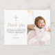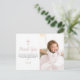 Agradeça a sua família e amigos por terem comparecido ao batismo da sua filha com uma foto da sua criança. O design rosa apresenta bolinhas brancas em um fundo de aquarela rosa no verso do cartão. Todo o texto pode ser personalizado, incluindo o nome da criança e a mensagem.