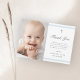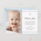 O clássico cartões de agradecimentos de batismo de stripe é um cartão postal moderno e limpo, com faixas de azul macio e uma cruz com foto na frente. A parte de trás é um postal endereçável. O tipo personalizável de cinza permite que você altere todas as informações da placa para seu gosto. Perfeito para o batismo de um menino.