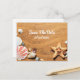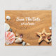 Casamento salve o cartão de posto de data com uma fotografia de uma praia arenosa com conchas. Personalize o texto personalizado para atender às suas necessidades de anúncio de casamento.
