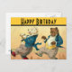 Ilustração vítrea de dois ursos dançarinos vestindo roupas humanas. No cartão postal, a faixa de ouro no topo tem "Parabéns"