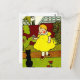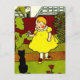 Trabalho de arte de safra bonita de uma garotinha num vestido amarelo segurando uma flor em um gatinho preto