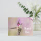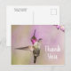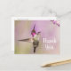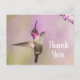 Lindo cartão postal de agradecimento com um beija-flor anna's rosa voando contra um fundo roxo e verde, olhando para cima e posando com as asas estendidas alegremente. Ao lado dele "Obrigado" está escrito em tipografia branca moderna. Belo cartão de agradecimento para amantes de pássaros, jardins e natureza. Foto tirada em Arcadia, Califórnia.