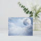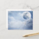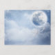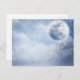 Um cartão postal com um céu azul cênico, com nuvens e uma lua grande e bela. 2 cisnes brancas voando juntas.