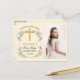 Agradeça à sua família e amigos por comparecerem à Primeira Comunhão de sua filha, enviando a eles um cartão postal de agradecimento com foto da Primeira Comunhão. Este cartão de agradecimento da Primeira Comunhão apresenta uma bela cruz dourada com uma moldura dourada contra um fundo amarelo suave de cor creme. Um buquê de belas flores em tons de pêssego e azul em estilo aquarela é colocado em cada canto. Coloque a foto de seu filho na frente e escreva uma mensagem pessoal pré-impressa com uma assinatura no verso para sua conveniência, bem como seu endereço de retorno.