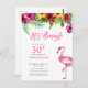 Defina o tom para uma celebração de aniversário de 30 anos divertida e estival com este lindo convite de festa "Let's Flamingle" em estilo de cartão postal! Com uma gota de floral tropical em aquarela brilhante de hibiscos coloridos, escova de garrafa, ave-do-paraíso brilhante e folhagem de palmeira, seguido por "Let's Flamingle" em rosa flamingo. Personalizado na frente em texto de rosa e verde correspondentes. Direitos autorais Elegant Invites, todos os direitos reservados