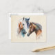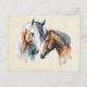 Um postal com um belo desenho de aquarela. Com um par de cavalos, castanho e branco. Cabeça e pescoço visíveis com tinta pingando na base do pescoço. Vírus sudoeste.