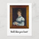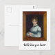 Este cartão-postal mostra uma pintura de uma mulher com um vestido azul. A foto tem uma grande estrutura de madeira, e a mulher está dizendo, "Bem, abençoe seu coração."