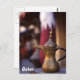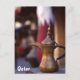 Um pote de café em frente a uma bandeira do Qatari no popular "Souq Waqif" de Doha. Um pote de café simboliza as boas-vindas em todo o mundo árabe.