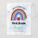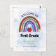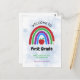 Um cartão postal bonito acolhendo estudantes para o primeiro ano. O design apresenta um arco-íris colorido, acentuado com um lápis vermelho e uma maçã. Personalize com o nome do professor e a escola.