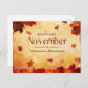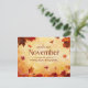 Celebre o encanto arecidamente do outono com este cartão-postal ilustrativo vermelho e laranja. Apresentando elementos naturais de queda, é perfeito para receber novembro, enviar saudações sazonais ou compartilhar uma nota quente com amigos e familiares.