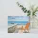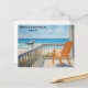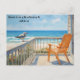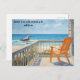 Este cartão-postal captura a beleza de um banco numa praia, com um pássaro empoleirado no trem e o sol brilhando ao fundo.