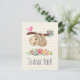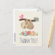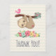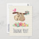 Cartão-postal de agradecimento com uma ilustração de uma preguiça marrom fofa pendurada de cabeça para baixo. Esse homenzinho engraçado está segurando um galho que tem um passarinho rosa de um lado e um buquê de rosas estilo doodle do outro lado. Abaixo deles há um arranjo de flores coloridas desenhadas à mão. Essa preguiça adorável também tem bochechas rosadas e 3 corações fofos no bumbum. Mensagem personalizada e endereço de retorno no verso. O texto pode ser excluído se você desejar escrever sua mensagem à mão.