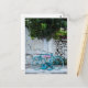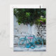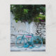 Uma bicicleta turquesa encostada a uma árvore destaca-se contra um fundo branco na ilha de Creta, na Grécia. Este cartão postal é totalmente personalizável.