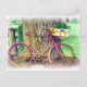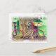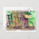 Uma bicicleta antiga se inclina contra uma árvore com uma caixa de madeira de flores no cesto da frente. Já lá está há algum tempo, a julgar pelas algas e pelo mofo que colorem a estrutura da bicicleta de metal e as defesas verdes. Foto colorida melhorada digitalmente.