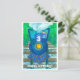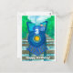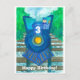 Um cartão de posto de aniversário feliz personalizado, com um homem feliz em um trem a vapor azul viajando em trilhos pelas árvores ilustradas com aquarela.