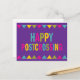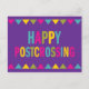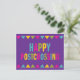 A mensagem de travessia feliz para amantes de cartões postais está em cores muito brilhantes, design tipográfico com faixas coloridas em cima e em baixo e um fundo roxo brilhante. Mala feliz!