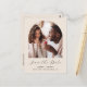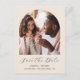 Este simples e minimalista cartão postal Save the Date apresenta uma fotografia em forma de arco acima das palavras "Save the Date" (Salvar a Data) em elegante guião branco, seguido pelos nomes dos casais, pela data do casamento e pela cidade em sans serif num fundo bege. Adicione o seu endereço de retorno juntamente com detalhes adicionais na parte traseira.
