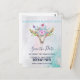 Um cartão postal com turquesa e fundo de aquarela pastel. Um crânio bicho-papão com um buquê floral sobre sua cabeça e pequenas borboletas se espalhando. Uma bela borda decorativa com pequenas formas de lágrimas em azul claro.