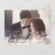 O obrigado de casamento elegante que você faz no cartão-postal mostra uma foto orientada a paisagem com cheio com uma cobertura de flare de luz de grande forma para um visual de bolha de chic. "Feliz para sempre" está sobreposto em letras negras e serif, com seus nomes ao lado. Adicione uma foto adicional à parte traseira, juntamente com uma mensagem de obrigado pré-impresso personalizado, em um fundo botânico neutro com padrão. Espaço fornecido para seu endereço de retorno e endereçamento de destinatário.
