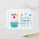 Um cartão postal de salvamento de data de aniversário (ou outro evento) com um fundo listrado azul claro e branco. Sobreposto no topo há um lindo cupcake azul com cobertura rosa e um rosto sorridente kawaii. Uma cereja no topo também tem um rosto fofo. Uma estrela cadente está voando no ar.