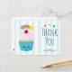 Cartão postal de agradecimento de aniversário com um fundo listrado de azul claro e branco. Sobreposto está um lindo cupcake azul com glacê rosa e uma carinha sorridente kawaii. Uma cereja no topo também tem uma carinha fofa. Uma estrela cadente está voando no ar.