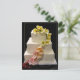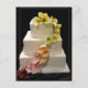 Lírios de calla, coloridos e colorido, colorido, em derramar amarelo, rosa, creme e pêssego, em um belo bolo de casamento branco. O fundo preto permite adicionar seu próprio texto.