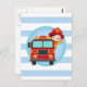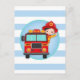 Este design apresenta um bombeiro preto giro no caminhão de bombeiros, balançando olá! Vermelho, azul, amarelo e turquesa com faixas largas.