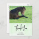 Obrigado cartão postal, com uma bela fotografia com um belo cavalo marrom deitado na grama, com aparência pacífica e contente.