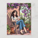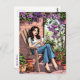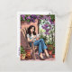 Um cartão postal para manter contato com um amigo. Uma bonito ilustração de uma mulher sentada do lado de fora do seu pátio relaxando, com uma xícara de café quente e seu cachorro dormindo aos seus pés. Ela está cercada por lindas plantas cercadas e penduradas.