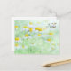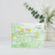 Cartão postal com uma fotografia fresca e de Verão, com uma coleção de margaridas selvagens com grandes centros amarelos a crescer num campo verde.