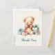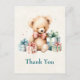 Obrigado postal com uma bela ilustração com um urso de pelúcia fofo. Vestindo um arco vermelho rico. Desenhado em um estilo vintage bonito e antigo. Presentes de Natal pastel vermelho e azul rodeados por este urso de coração quente.