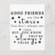 "Bons amigos são como estrelas. Nem sempre os vemos, mas sabem que estão sempre lá. "Esta design capta a essência de uma amizade duradoura, usando a analogia das estrelas para ilustrar a presença inabalável de bons amigos. É um lembrete de que os verdadeiros amigos estão sempre lá, oferecendo apoio e conforto mesmo quando a distância ou as circunstâncias o afastam. Esta citação ressoa com qualquer um que aprecie o vínculo duradouro com os seus amigos mais próximos.