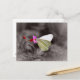 Um belo cartão postal preto-e-branco com coloração seletiva na borboleta branca amarelada beijando uma flor silvestre rosa bonito.