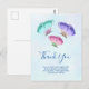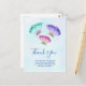 Cartão postal de agradecimento com um design feminino delicado. 3 borboletas em aquarela, pintadas de rosa, roxo e verde. Um fundo de aquarela azul claro com toques de rosa claro.