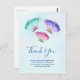 Cartão de agradecimento com um design feminino delicado. 3 borboletas em aquarela, pintadas de rosa, roxo e verde. Um fundo de aquarela azul claro com toques de rosa claro.