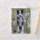 Este cartão postal canino divertido apresenta um retrato de um sorridente cachorro de Collie, preto e branco, de pé em um toco de árvore na floresta. A parte de trás do postal é vazio para a sua mensagem.