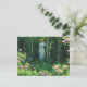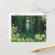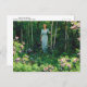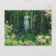 Um cartão-postal de belas artes com a pintura Edge of the Woods (1921) de Charles Courtney Curran (1861-1942), um artista impressionista americano. Uma paisagem mostrando uma mulher vestida de azul entre as árvores do bosque, com arbustos louros de montanha carregando flores cor-de-rosa no primeiro plano.