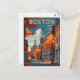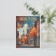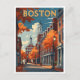 A retro-style travel poster captures a charming autumnal street scene in Boston, with historic brick buildings and vibrant orange-leafed trees under a blue sky, and "BOSTON" boldly displayed at the top.