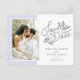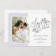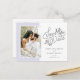 Um belo cartão postal Save the Date com a sua fotografia enquadrada por uma forma roxa e realçada com a letra "Save the Date" e o gráfico botânico. Adicione seus nomes e data para personalizar. Na parte de trás, mais detalhes do casamento. Simples e clássico, mas elegante e chique - coordena-se bem com tantos dos atuais estilos de casamento.