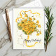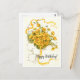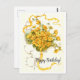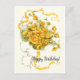 Cartão de aniversário antigo com flores amarelas vibrantes em um fundo floral decorativo.