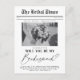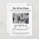 Quando for a hora das suas propostas da Bridesmaid, este cartão postal de jornal de tendência é o sentimento perfeito. Apresentando o texto "Você será minha dama de honra?" em um estilo minimalista preto e branco com o título "O Bridal Times". Mantenha esta foto, ou troque-a por uma de suas! Este design elegante dá um toque pessoal à sua proposta de ajuda a ponte. Fácil de personalizar com o nome do seu amigo e uma mensagem pessoal.