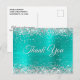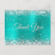 Crie seus próprios cartões-postais de agradecimento com caligrafia elegante para o seu aniversário. Brilho falso prateado brilhante com faíscas contra um fundo espelhado turquesa brilhante falso e glamouroso. Todos os efeitos brilhantes e cintilantes neste design moderno e feminino são criados com gráficos digitais.