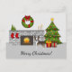 A ilustração original de desenho animado de Destei de um cachorro da raça Boston Terrier, de cor branca e brindle. O cão é colocado numa sala festiva que tem uma lareira e muitas decorações de Natal, incluindo uma árvore de Natal verde, algumas meias vermelhas e uma coroa com um arco vermelho. Há também uma área de texto personalizável que agora diz: "Feliz Natal!".