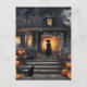 Uma bruxa fica nas escadas de sua assustadora casa assombrada no Halloween. As escadas têm abóboras, e há um gato preto.