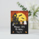 Este cartão de aniversário divertido e assustador pode ser personalizado com um nome ou título, como filha, neta, sobrinha, amiga, etc. Ele apresenta uma bruxa fofa e um fantasma ao lado de uma casa assombrada torta. Ao fundo, há uma lua cheia com morcegos e um céu noturno laranja com estrelas. O texto combina fontes decorativas e serifadas para uma aparência elegante e moderna. Isso é perfeito para o Halloween.