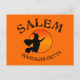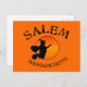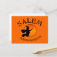 bruxa do Halloween de Salem Massachusetts - bruxa negra sobre vassoura voando através da lua vermelha e laranja do halloween. Fundo Laranja.