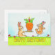 Peça este belo cartão para desejar um Feliz Aniversário a alguém. No centro deste cartão, dois coelhos se juntaram, o da esquerda está sorrindo e segurando um prato de servir ao da direita. Nele está um bolo de aniversário. Uma enorme cenoura laranja está a sair dela. Ela tem uma vela vermelha e solteiro acesa saindo do meio de suas folhas. O segundo coelho está tão alegre pela visão, ele pula no ar, espalhando seus pequenos braços e rindo. Ele está vestindo um chapéu colorido. Os coelhos estão em frente a um fundo azul claro, sobre uma erva verde-clara, na qual as palavras "Parabéns" são escritas manualmente em letras amarelas.