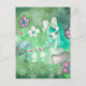 Cute kawaii girl with aqua blue hair, sitting on a mushroom, and visiting with two sweet kawaii white bunnies. Butterflies flit amongst the flowers.
